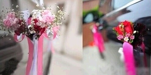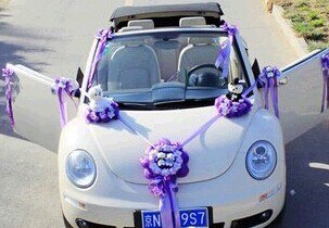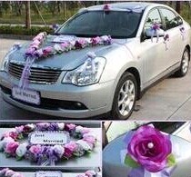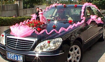 車門鮮花裝飾必不可少,能起到畫(huà)龍點(diǎn)睛的作用。普通的裝飾以1-2朵月季、扶郎、康乃馨配以少許葉材花卉,品種忌混用,用包裝紙包裝,扎上蝴蝶結(jié),再用包裝帶、膠帶紙將其固定在車門的把手上即可。若是高檔的裝飾,則用紅掌、百合、跳舞蘭、蝴蝶蘭等高檔花配以少許葉材、滿天星、情人草等配花,扎成小束花,再將其固定在車門把手上。